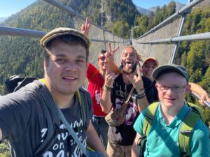 gegangen. Kolja ist dann doch noch nach oben gegangen, das war leider auch mein Fehler…und hat leider zu ein bisschen Irritation gesorgt. Philippe, „Ommi“,Laura, Merten, Folke und Ugo sind dann über die Brücke gegangen. Philippe u Ugo war es schon etwas mulmig…